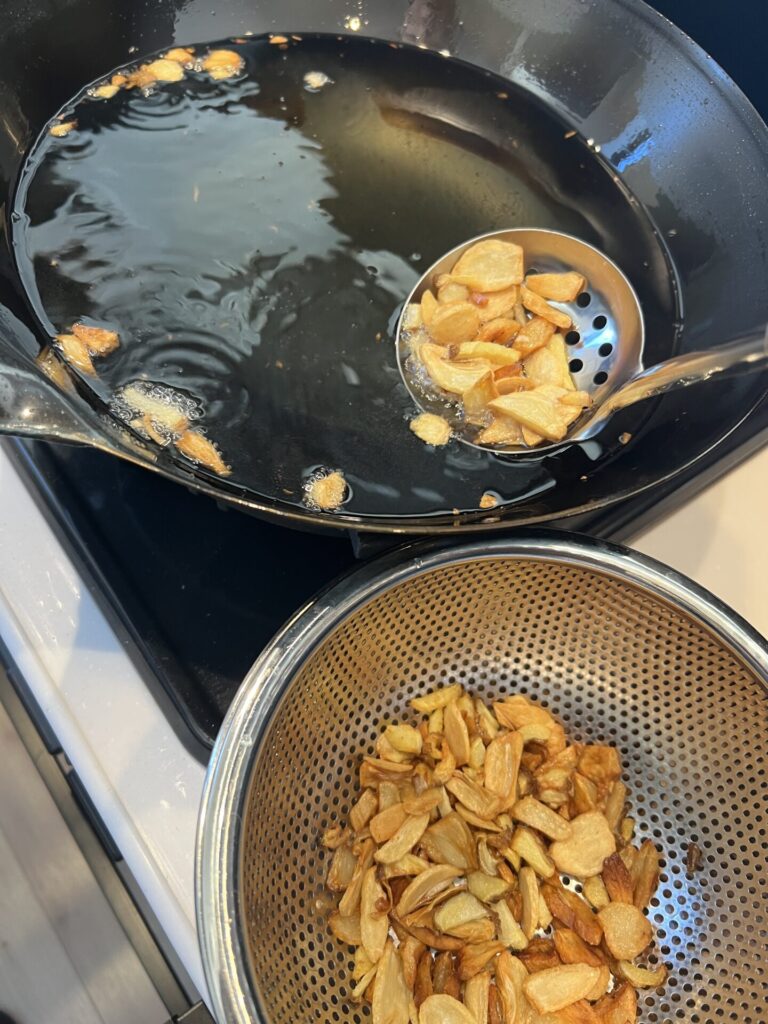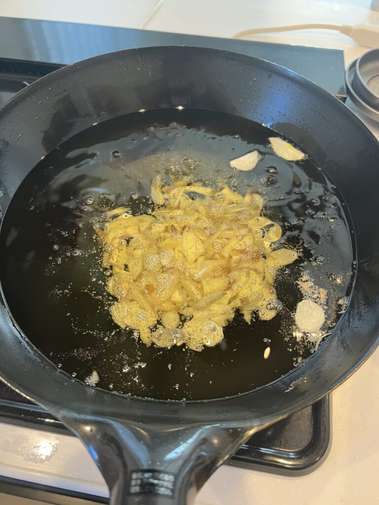 - ニンニク、生姜を中火〜弱火で揚げる
