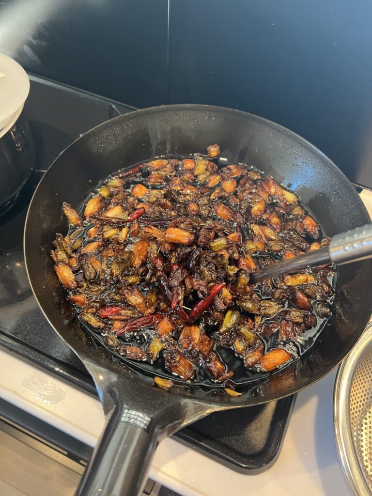 - ネギ、鷹の爪を中火〜弱火で揚げる
