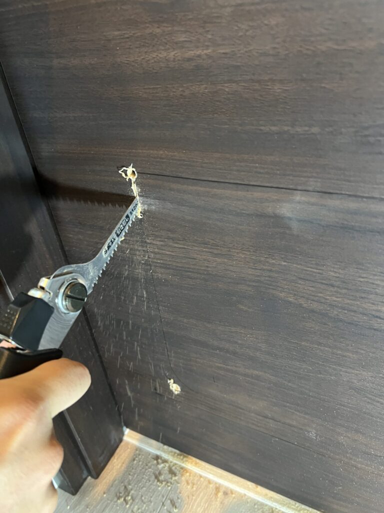 ノコギリが入るように、適当な太さのドリルビットで四隅に下穴を開けます。